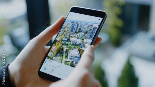 person, hand, hand, holding, smartphone, screen, display, aerial, view, house, building, city, city landscape, residential, area, neighbourhood, suburban, landscape, tree, grass, sky, cloud, window, background, blurry, technology, modern, digital, cyberspace, app, application, mobile, device, interface, home, property, architecture, urban, outdoors