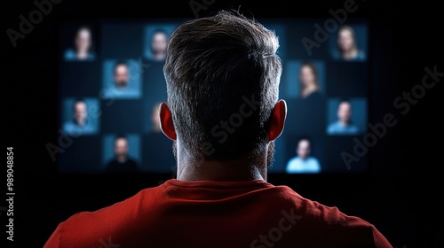 person, screen, video, call, technology, communication, virtual, remote, meeting, connection, digital, social, interaction, engagement, isolation, modern, workspace, people, portrait, face, dark, professional, online, human relationships, teamwork, lifestyle, rear, viewing, audience, expression, emotion, hair, red, shirt, male, profile, studio, background, zoom, conference, distance, cyberspace, device, monitor