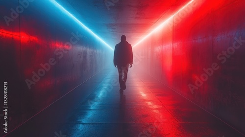 tunnel, person, walking, futuristic, red, blue, light, neon, corridor, abstract, modern, empty, dark, pathway, silhouette, space, urban, technology, underground, passage, perspective, interior, glow, vibrant, colours, atmosphere, adventure, mystery, gaming, darkroom, grunge, passageway, art, design, trendy, stylish, elegant, high technology, dramatic, colourful, digital, trend
