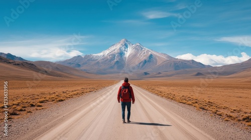 person, walking, road, mountain, landscape, nature, sky, cloud, solitude, adventure, exploration, travel, scenery, path, terrain, hiking, destination, journey, altitude, wilderness, daylight, freedom, scenic, tranquil, picturesque, immensity, earth, majestic, backpack, expanse, brown, rock, field, ground, beauty, fresh air, peaceful, horizon, dramatic, fisheye, remote, serene, breathtaking, vibrant, sunny