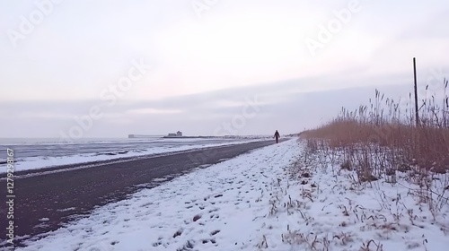 Person Walking on a Snowy Beach under Cloudy Sky in Winter with Sea Horizon