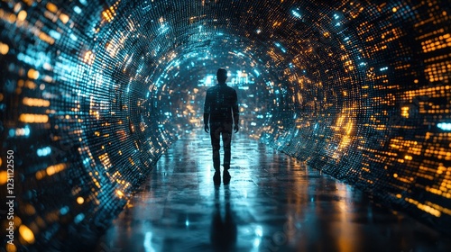 person, walking, tunnel, digital, datum, information, technology, future, network, progress, innovation, code, binary, light, glowing, bright, dark, abstract, futuristic, fi, science, fiction, journey, path, destination, exploration, discovery, mystery, enigma, perspective, depth, space, surreal, vibrant, colours, blue, orange, yellow, black, silhouette, man, alone, ground, floor