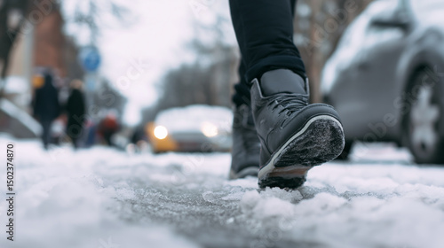 winter, snow, boot, street, city, walking, jean, urban, cold, season, person, footwear, yellow, weather, road, snowfall, fashion, freezing, ice, transport, traffic, snowy, pedestrian, footstep, people, shoe, style, slush, storm, distance, clothing, leg, temperature, w
