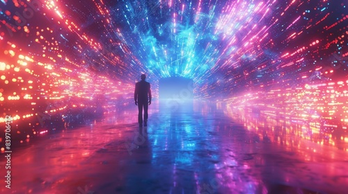 person, walking, tunnel, digital, light, vibrant, futuristic, atmosphere, mesmerizing, colourful, glow, neon, path, technology, bright, modern, surreal, journey, travel, urban, city, cyber, illumination, spectacle, science fiction, night, adventure, background, concept, dream, fantasy, light, mysterious, nightscape, scenery, shine, shining, sight, space, street, traveler, universe
