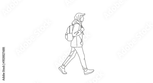 person, walking, backpack, phone, hand, line, art, drawing, minimalist, outline, figure, isolated, white, background, single, 1, human, silhouette, casual attire, clothing, jean, shoe, hoodie, activity, movement, stride, forward, travel, commute, student, youth, modern, technology, communication, connection, digital, device, mobile, concept, simple, clean, vignetting, illustration, graphic, design, vector, icon