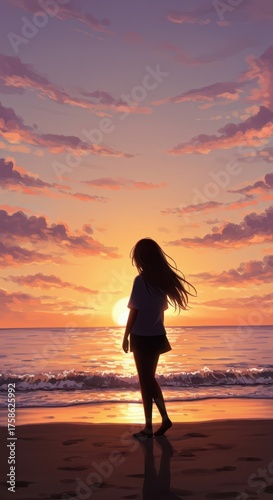sunset, ocean, beach, wave, sand, sky, cloud, twilight, evening, dusk, serene, peaceful, calm, tranquil, solitude, silhouette, horizon, nature, landscape, seascape, coastline, shore, summer, warmth, light, orange, pink, purple, water, sea, tropical, idylli, picturesque, beautiful, illustration, drawing, artwork, fantasy, atmospheric, melancholic, contemplative, longing, freedom, journey, beginning, end, colourful