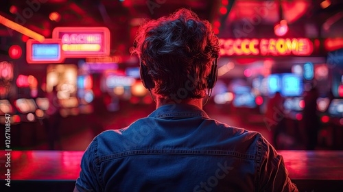arcade, gaming, neon, atmosphere, entertainment, person, earphones, light, machine, fun, excitement, leisure, nightlife, technology, social, indoor, vibrant, life events, relaxation, youth, colourful, activity, modern, sound, thrill, play, culture, interaction, community, engagement, design, environment, enjoyment, optical, dynamic, challenge, skill, competition, adventure, exploration, digital, socialising, group, friends, destination