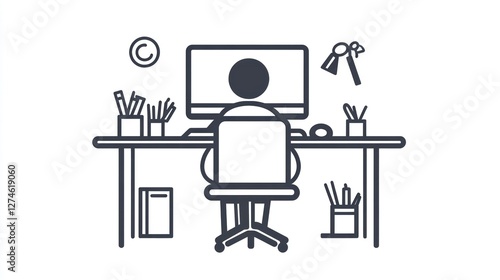 person, work, office, desk, computer, design, illustration, vector, interior, background, sitting, employee, business, workspace, modern, home, office worker, professional, productivity, focused, concentrated, creative, technology, laptop, mouse, keyboard, supply, pen, drawing, art, designing, graphic, digital, sharpened, colours, monochrome, silhouette, line art, outline, vignetting