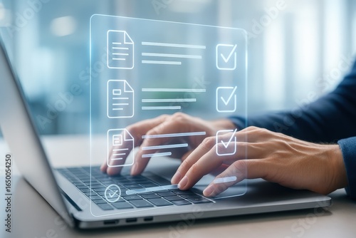 Person working on a laptop with holographic checklist.