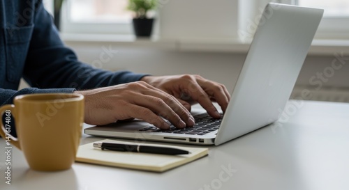 laptop, hand, typing, keyboard, work, computer, office, desk, technology, business, workplace, productivity, hot drink, cup, notebook, pen, indoor, daytime, light, beige, neutral, sharpened, detail, closeup, modern, digital, communication, cyberspace, online, portable, workstation, human, person, working, professional, efficiency, focused, contemporary, success, remote, home