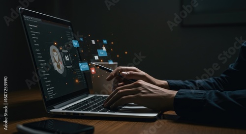 artificial intelligence, laptop, computer, technology, work, person, hand, dark, room, desk, wooden, digital, interface, graphic, light, effect, modern, setting, professional, workflow, advancement, software, development, design, programming, working, night, indoor, focused, concentrated, user, workplace, contemporary, productivity
