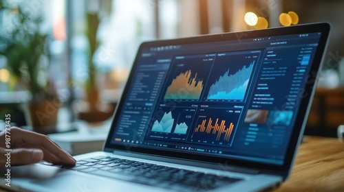 laptop, person, hand, screen, chart, graph, datum, financial, analysis, business, technology, office, work, workspace, desk, keyboard, display, trend, digital, software, interface, statistic, investment, market, growth, performance, research, information, monitor, table, wood, blur, window, light, green, white