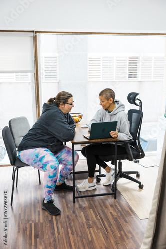 dietitian, personal, trainer, client, laptop, office, consultation, weight, loss, diet, health care, healthy, lifestyle, fitness, wellness, advice, support, guidance, talking, communication, plan, program, goal, progress, result, obesity, overweight, health, eating, food, nourishment, computer, technology, digital, meeting, discussion, sitting, desk, chair, woman, female, professional, expert, help, motivation, inspiration, physical exercise, exercise, management