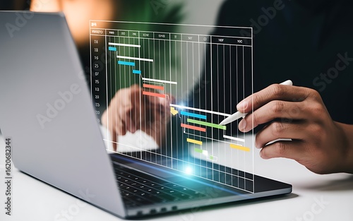 chart, project, management, timeline, planning, strategy, business, laptop, screen, technology, datum, analysis, visualisation, digital, work, office, concept, task, schedule, progress, development, organisation, workflow, software, computer, graphic, diagram, report, meeting, presentation, professional, person, hand, stylus, interaction, interface, colours, bar, calendar, date