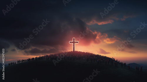 Persons walking to the safety of the Cross on a mountain