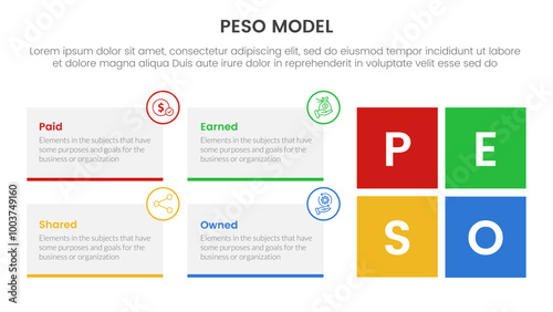 PESO Model strategic framework infographic 4 point stage template with rectangle box container and square shape for slide presentation