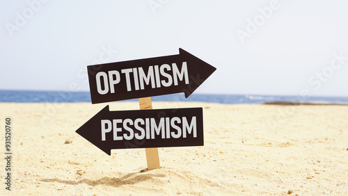 Pessimism and optimism are shown using the text. Signpost outside is showing Optimism and Pessimism