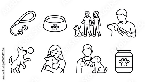 pet, care, icon, training, grooming, veterinary, leash, bowl, vet, medicine, love, owner, playing, feeding, doctor, animal, health, dog, illustration, outline, character, service, human relationships
