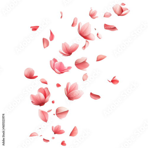 Petal flowers flying in the air in spring season, Soft flower petals floating gracefully in the air, isolated on transparent background