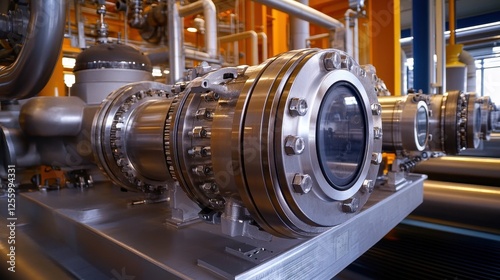 Petrochemical plant electric pump, showcasing polished metal housing and heavy-duty piping.