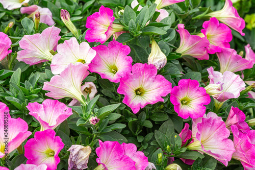 Petunia pink-white is blooming and prolific flowering consistently all summer, Nature photos. Selective focus.