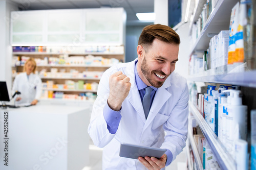 Pharmacist checking medics inventory on tablet computer in pharmacy store.
