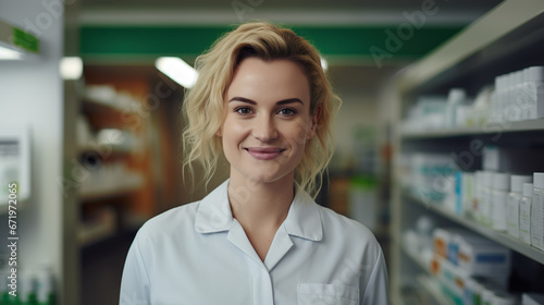 Pharmacist, white woman, blond hair, white apron. smiling slightly, confidence in his eyes.