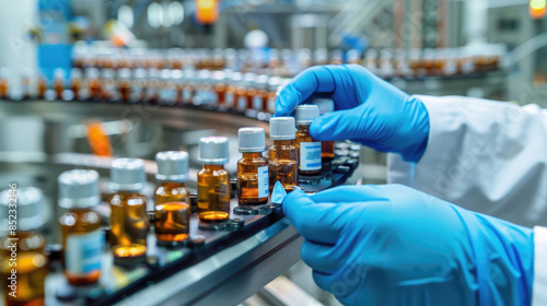 Pharmacist with Gloves Checking Vials on Conveyor Belt