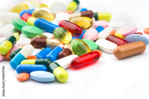 Pharmacy theme. Multicolored Isolated Pills and Capsules on the White Surface. Closeup