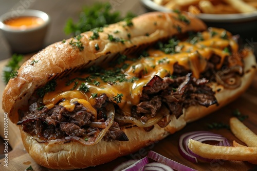 Philly Cheesesteak - Philly cheesesteak sandwich with melted cheese and onions.