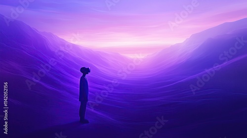 Philosophical contemplation scene, a lone human wearing advanced VR goggles, situated in a surreal landscape, illustration