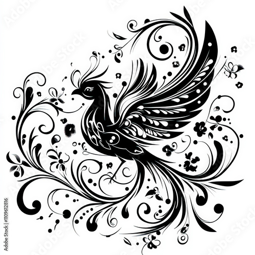 phoenix, silhouette, black, white, illustration, isolated, background, floral, vector, design, pattern, flower, art, ornament, decoration, element, swirl, scroll, vintage, tattoo, leaf, decor, shape, drawing, nature, border, curve, ornate, plant