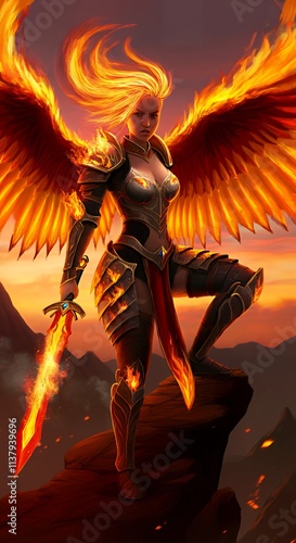 Phoenix Warrior with Fiery Wings and Flaming Sword at Sunset