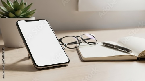 Phone, a pair of glasses and a pen are on a table. for mock up