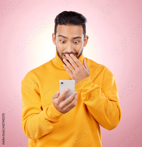 Phone, wow or gossip with a surprised man in studio on pink background reading fake news announcement online. Mobile, shock and wtf with a young male person on a social media website or the internet