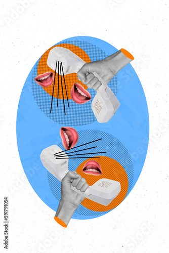 Photo 3d collage poster magazine caricature of human mouth share news information gossip loud voice isolated on white drawing background