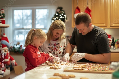 photo A family decorating cookies together, with frosting, sprinkles, and holiday decorations filling the kitchen
