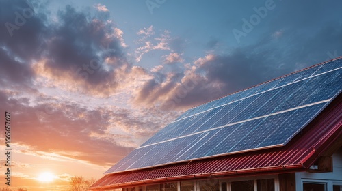 Photo collage of solar panels, photovoltaics on the red roof of a house and a beautiful sky with the setting sun. Alternative electricity source. Concept of sustainable resources