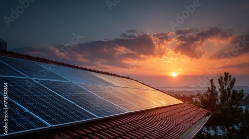 Photo collage of solar panels, photovoltaics on the red roof of a house and a beautiful sky with the setting sun. Alternative electricity source. Concept of sustainable resources