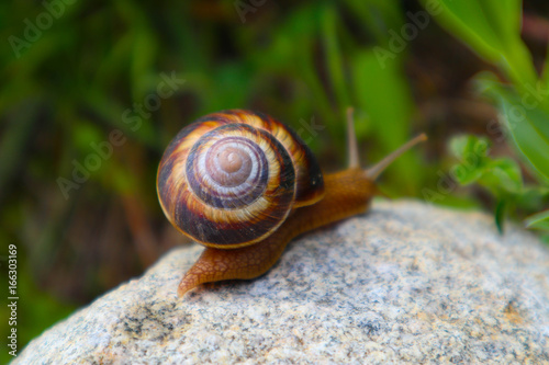 Photo depicts a wild lovely big beautiful snail with spiral shell. Amazing helix in the garden, crawling in a stone. Fresh green grass on the background, good sunny weather. Marco, close up view.