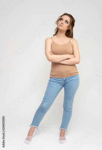 Photo full-length portrait of a pretty brunette woman girl with long beautiful curly hair on a white background in a t-shirt and blue jeans. Talking while standing in front of the camera.