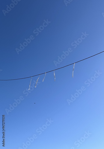 icicle, wire, close, up, colours, photo, winter, sky, clear, weather, cold, blue, nature, ice, glacé, season, frost, chill, hanging, daylight, natural, crisp, vertical, electricity, dangling, electric, line, detail, view, climate, clean, minimalistic, white, background, bright, scenic, tranquil, horizontal, fresh, atmospheric, seasonal, exposure, icicle