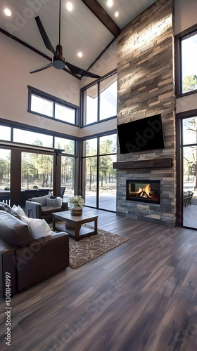 Photo Modern Living Room Interior Design Fireplace Stone Wall Wood Floors High Ceiling