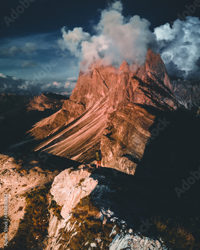 Photo near the edge. Beautiful sunset in the Italian majestic Seceda dolomite mountains.