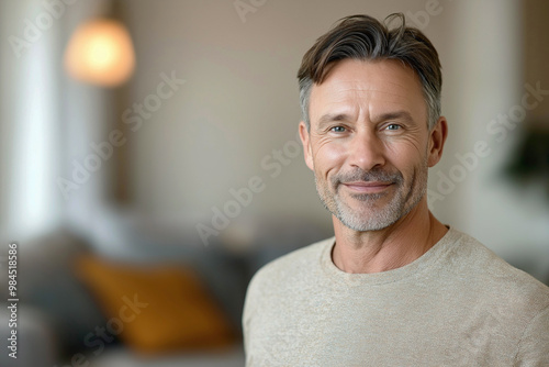 Photo of a 50-year-old European man in a light jacket on the right. The man is in the living room. Advertising banner.