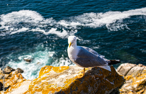 Photo of a beautiful and young seagull on top of a rock with the ocean in the back in Cies Island, in Galicia, Spain. Sunny day, summer, holidays.