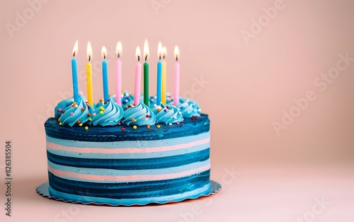 Photo of A blue striped birthday cake with colorful candles on top, on light pastel background, front view, copy space concept, minimalism stock photo