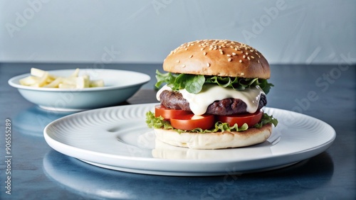 Photo of a burger, on a plate, a fatty piece of meat, a bun, processed cheese, tomato, onion, sauce, greens, on a table decorated with herbs