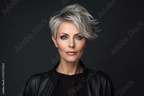 Photo of a business 50 year old woman, wearing a simple blouse, eye contact, dark background