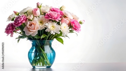 Photo of a charming bouquet of pink and white roses, ranunculus, and chrysanthemums in a teal vase, isolated on white background